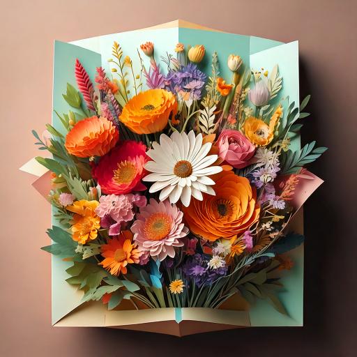 Get well soon card with multicolored floral arrangement made of paper inside.